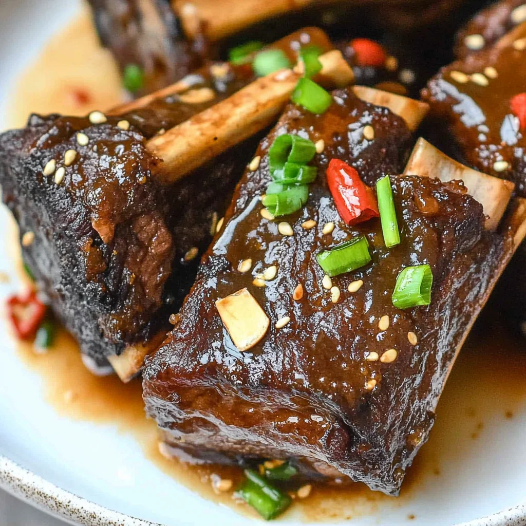 This recipe yields four generous servings of tender, flavorful beef short ribs that are perfect for sharing. To elevate your meal, serve the short ribs over a bed of fluffy jasmine rice or creamy mashed potatoes, allowing the rich glaze to soak in and enhance each bite. Garnish with sliced scallions and toasted sesame seeds for a pop of color and crunch, making for an appetizing presentation that’s sure to impress.