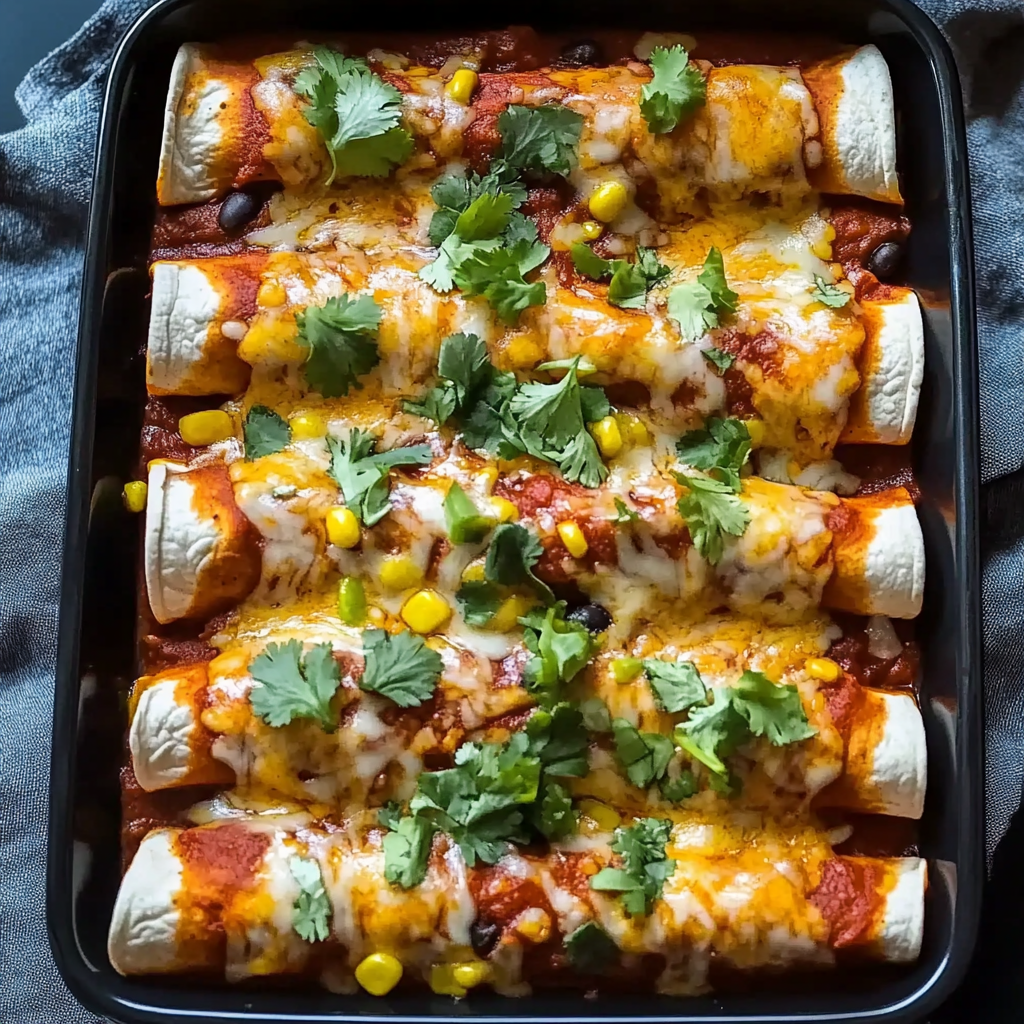 Step 6: Bake with Sauce and Cheese Pour enchilada sauce over the rolled tortillas and sprinkle shredded cheese on top before baking at 350°F (175°C) until bubbly and golden brown, about 20 minutes.