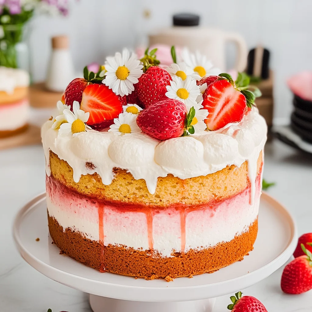 What sets this cake apart is its masterful balance of flavors and textures; the lightness of the sponge pairs beautifully with the lush cream and juicy strawberries, creating a symphony of taste that dances on the palate. With each bite, you’re not just enjoying dessert—you’re experiencing a moment of pure joy that beckons you to share it with loved ones. Embrace the warmth and delight of this exquisite creation as you gather around the table, where every slice brings smiles and sweet memories.