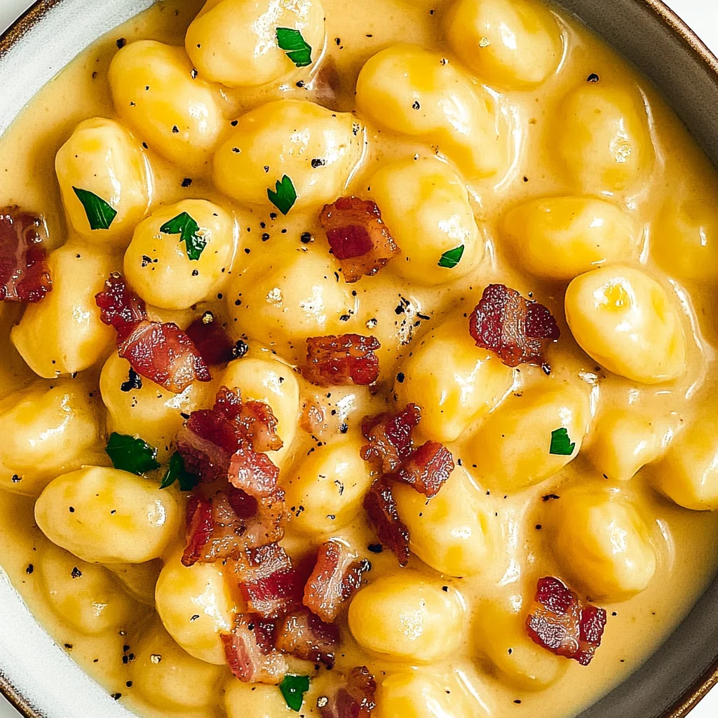 A creamy and savory dish combining tender gnocchi with crispy bacon and rich Parmesan cheese, perfect for a comforting meal.