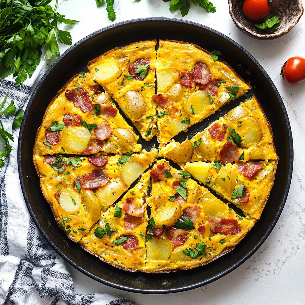 To store leftovers, place the frittata in an airtight container in the refrigerator, where it will keep well for up to three days. When reheating, use a skillet over low heat to gently warm slices of the frittata, adding a splash of milk or broth to maintain moisture and prevent drying out the crispy bacon and tender potatoes. While this dish is best enjoyed fresh, it can be frozen; however, be aware that the texture may change slightly upon thawing.