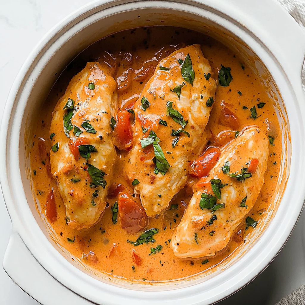 Slow Cooker Creamy Tomato Basil Chicken is a simple yet flavorful dish made with chicken breasts cooked in a rich blend of tomatoes, marinara sauce, garlic, and cream infused with fresh basil. The slow cooking method ensures that the chicken remains tender while absorbing all the delicious flavors from the sauce. It’s a perfect weeknight meal that pairs well with pasta or rice.