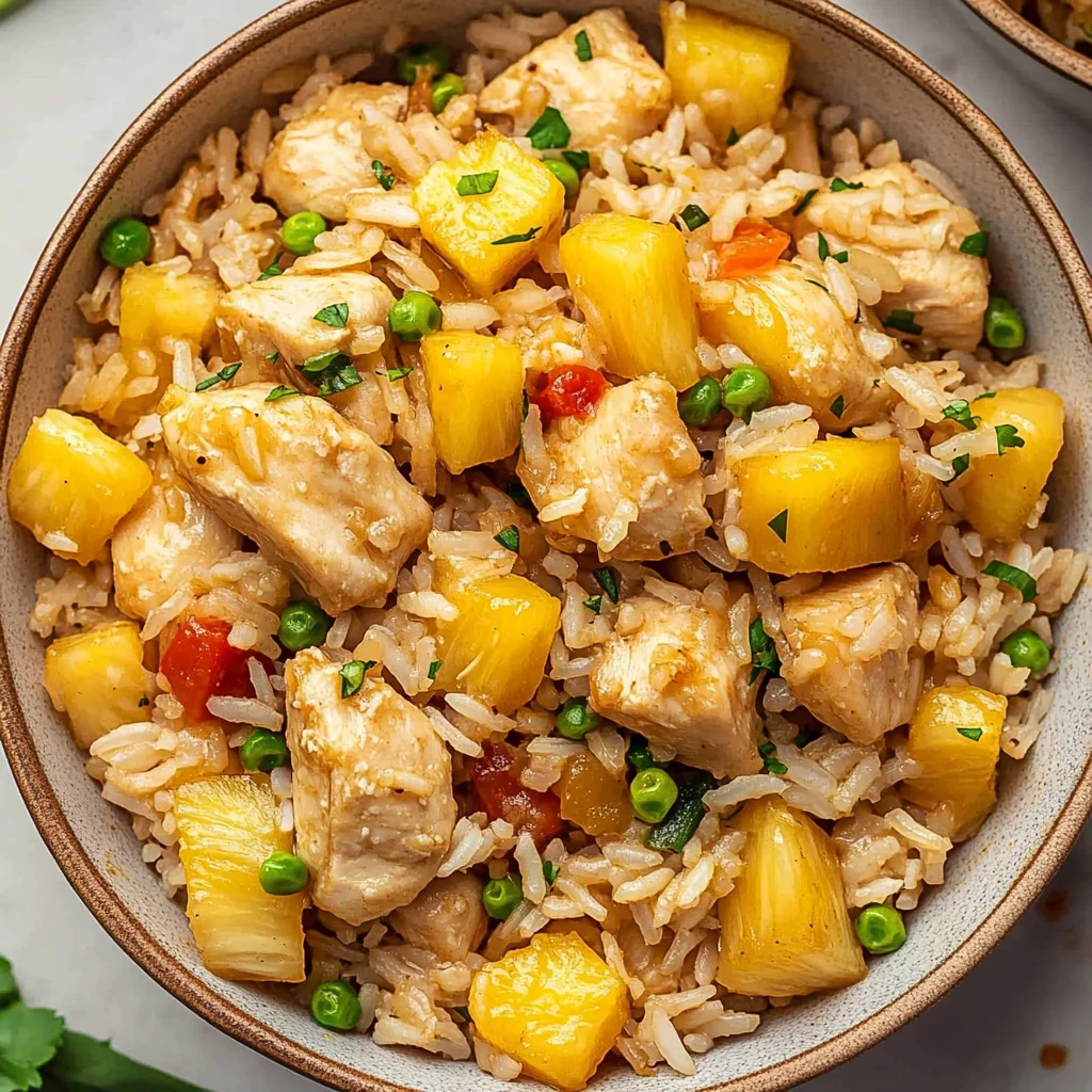 Picture a vibrant plate of Pineapple Chicken and Rice, where tender chicken pieces glisten with a golden glaze, nestled among fluffy grains of rice that soak up the sweet, tangy sauce. The aroma wafting from the dish tantalizes the senses, effortlessly transporting you to a tropical paradise, making it an ideal choice for a comforting weeknight dinner that feels both familiar and exotic.