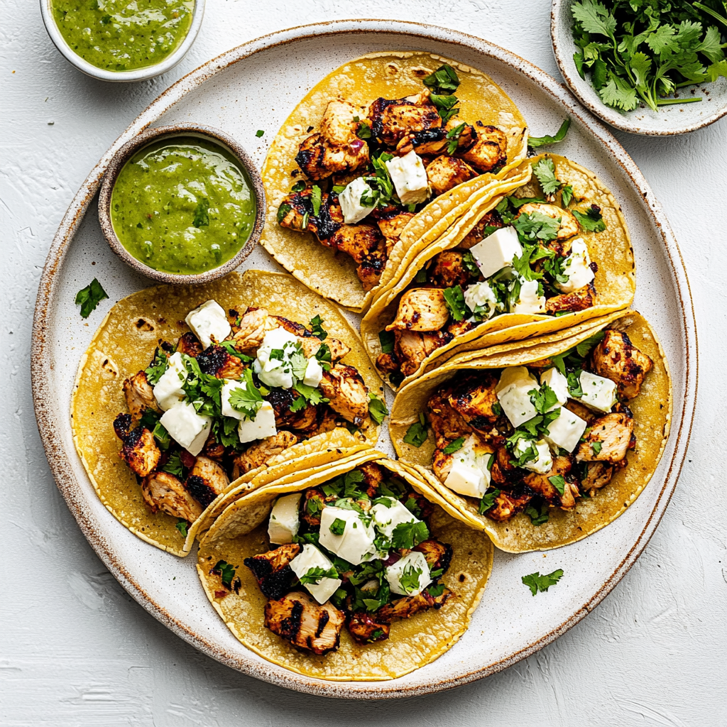 A vibrant and flavorful dish featuring marinated chicken served in warm corn tortillas, garnished with fresh cilantro, diced onions, and lime wedges.