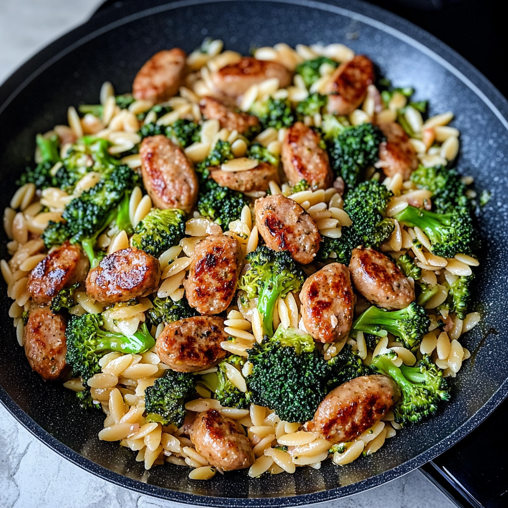 A delightful one-pan meal that combines savory chicken sausage with tender broccoli and orzo pasta, cooked in a flavorful broth.
