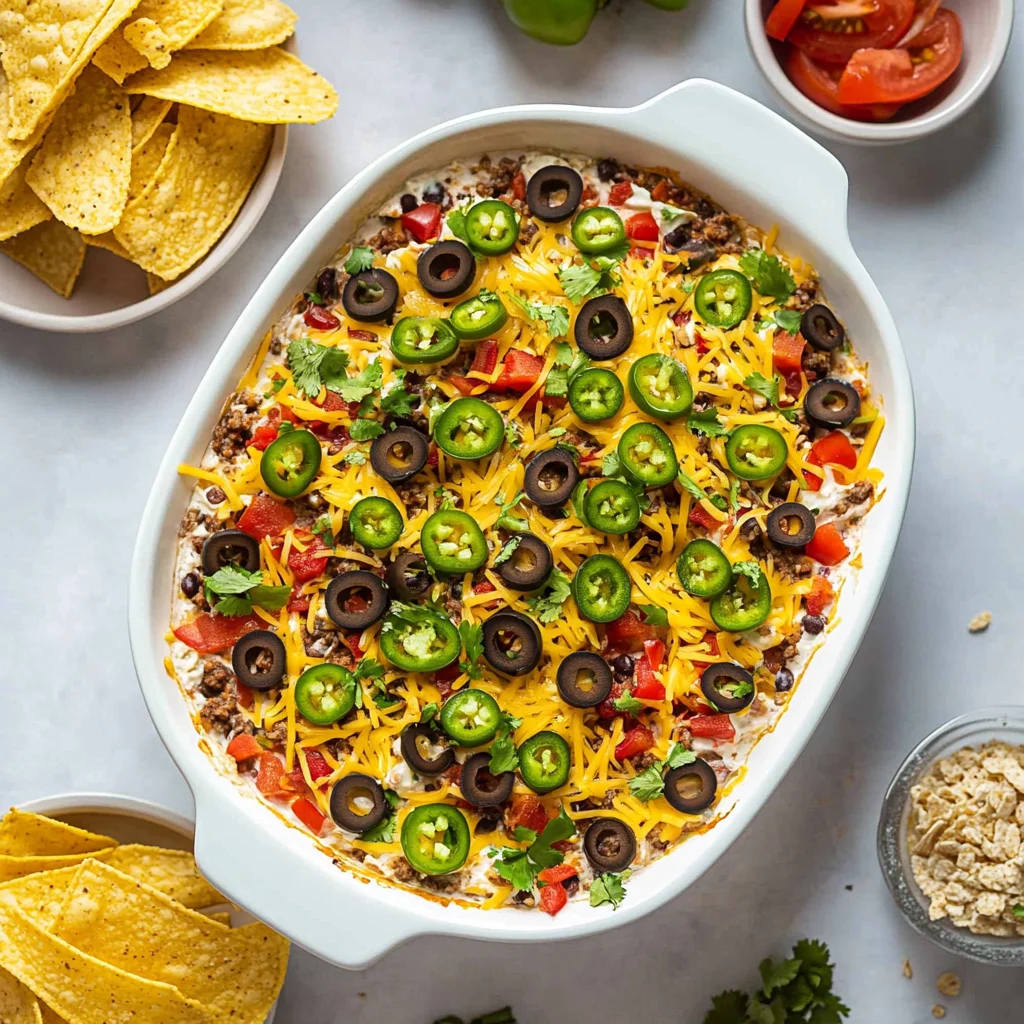 How can I adjust the spice level of the dip? To adjust the spice level, consider using a spicier taco seasoning or adding diced jalapeños or chili powder to the dip base. You can also serve it with hot salsa on the side for an extra kick.