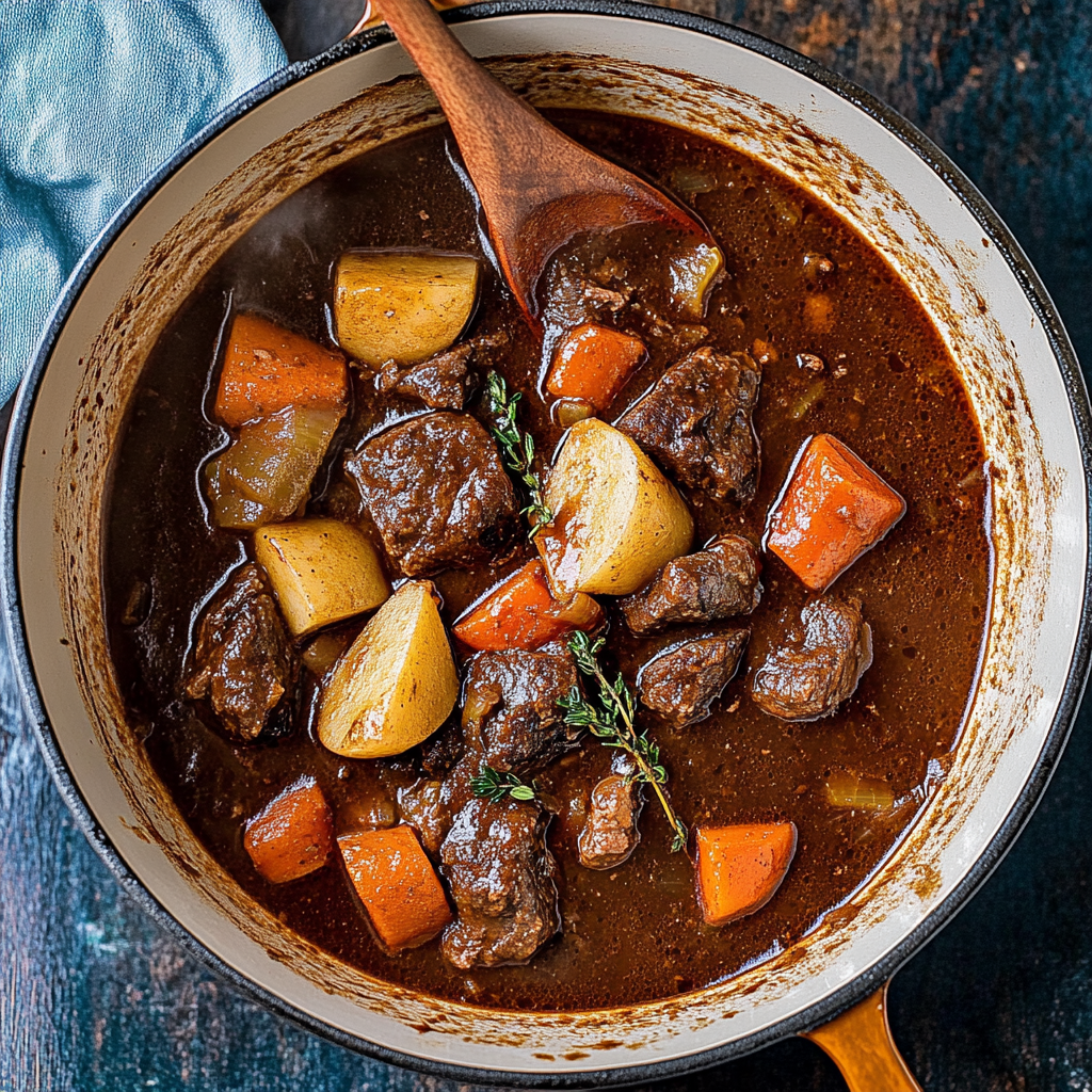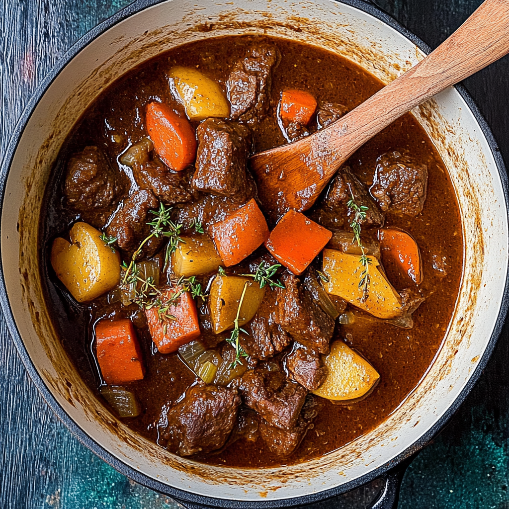 Guinness Beef Stew is a hearty dish made with tender chunks of beef simmered in a rich gravy flavored with Guinness stout beer. This iconic Irish recipe combines vegetables like potatoes and carrots with aromatic herbs, making it a warming meal perfect for chilly evenings or festive occasions.